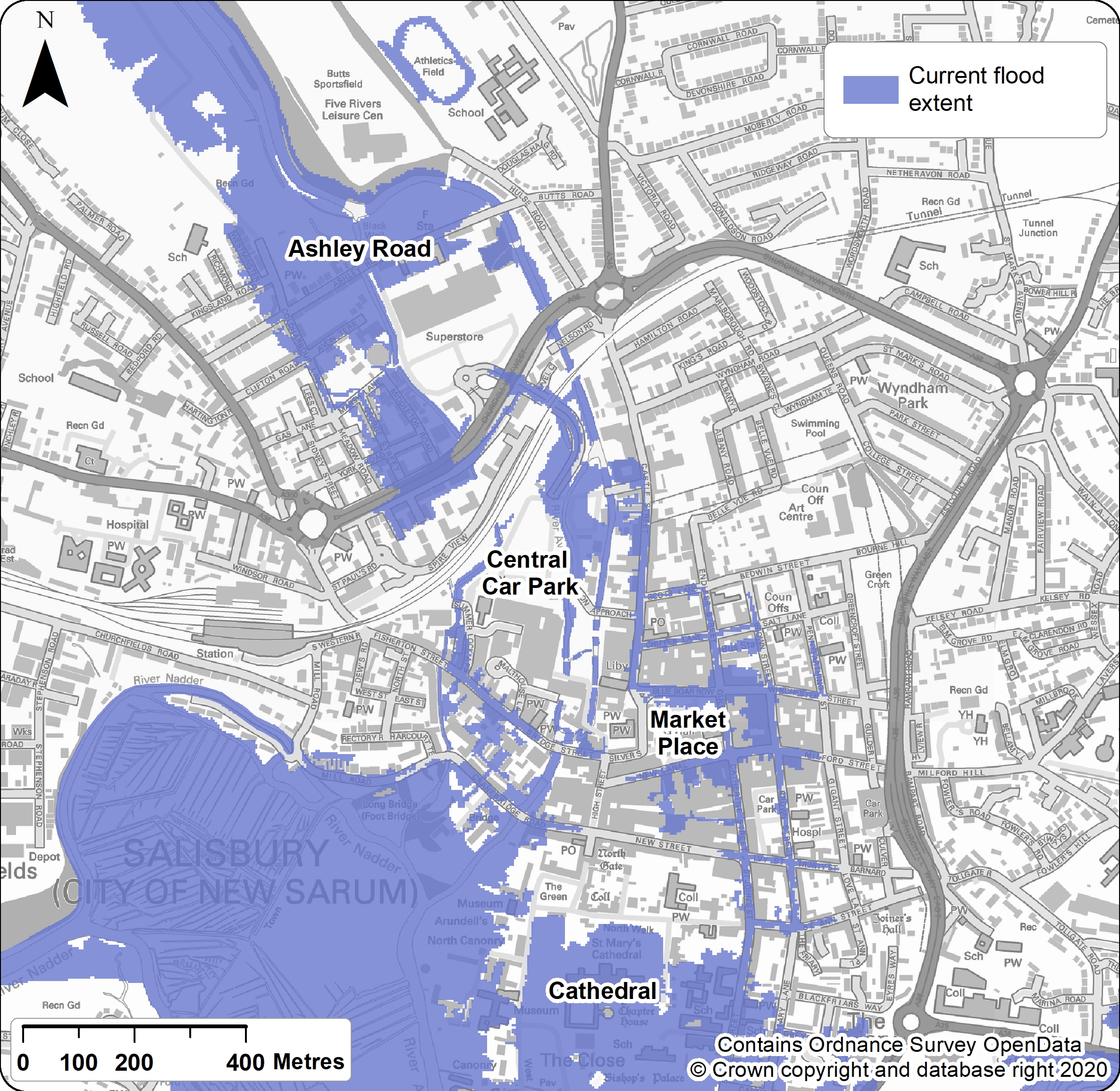 The following figure shows the flood risk in the centre of Salisbury, with key locations marked.